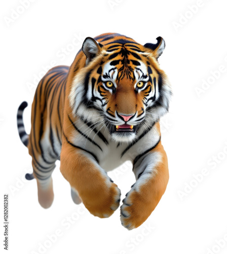 © Red X and Co, Naklejka premium Dynamic Bengal Tiger Leaping Forward with Intense Gaze and Striking Striped Fur, Isolated on Transparent and White Background