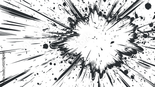 Obraz premium Dynamic black and white comic-style explosion illustration with splatters.