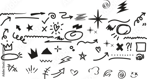 Obraz premium Dynamic black and white doodle elements including stars, arrows, swirls, and...