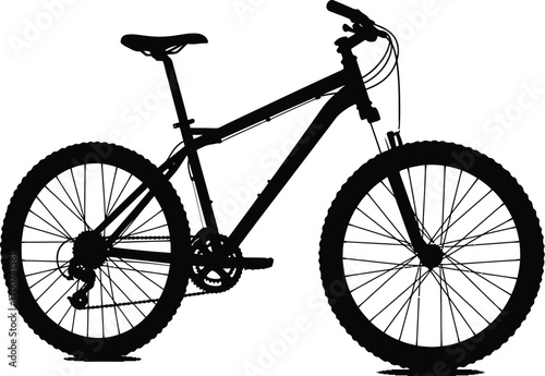 Obraz premium Dynamic black silhouette of mountain bike isolated on white background, perfect for outdoor adventure and sports projects, ideal for travel and health concepts