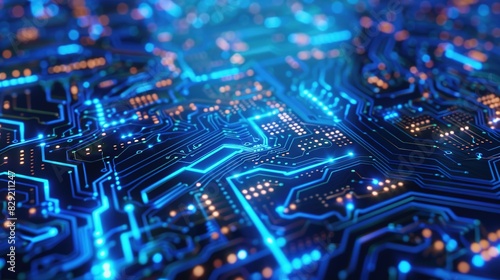© Vikarest, Obraz premium Dynamic blue circuit board closeup: Visualizing cyber security and data flow