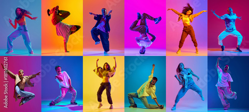 Naklejka premium Dynamic breakdance collage featuring 10 diverse dancers in bold neon studio lighting. Concept of modern street culture visuals, energetic dance promotion, and youth lifestyle content