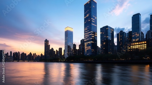 Fototapeta premium Dynamic city skyline at dusk by water reflecting lights showcasing urban...