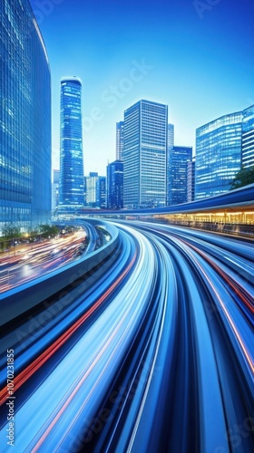 Obraz premium Dynamic cityscape with illuminated roads and modern skyscrapers.