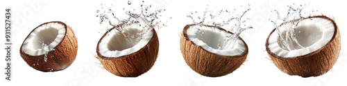 Fototapeta premium Dynamic coconut splash sequence showcasing fresh coconut water in action, perfect for tropical-themed designs. isolated on a transparent background