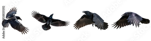 Naklejka premium Dynamic collection of majestic black crows in various flight postures,...