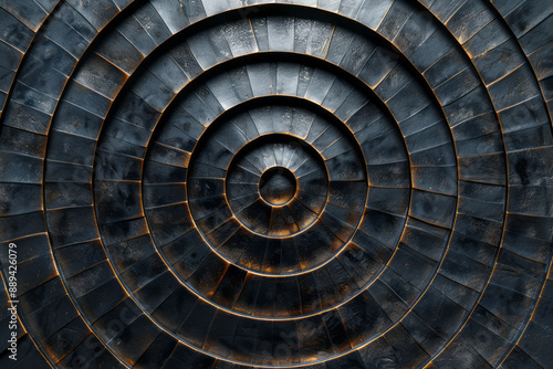 Fototapeta premium Dynamic concentric circular pattern with a reflective metallic finish, creating a visually striking effect on a dark background,