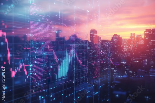 © julija, Fototapeta premium dynamic 3d financial data visualization over american flag backdrop, sunset cityscape, holographic stock market charts