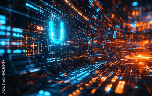 © Nattapat, Fototapeta premium Dynamic 3D rendering of a timeline with a glowing blue pin for 2025, surrounded by digital holographic lines and floating data symbols