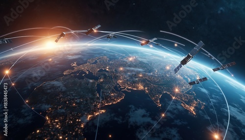 © Pete, Naklejka premium Dynamic 3D rendering of multiple satellites in orbit around Earth. Illuminated continents showcase global connectivity. Illustrates advanced space technology, communication networks. Complex orbital