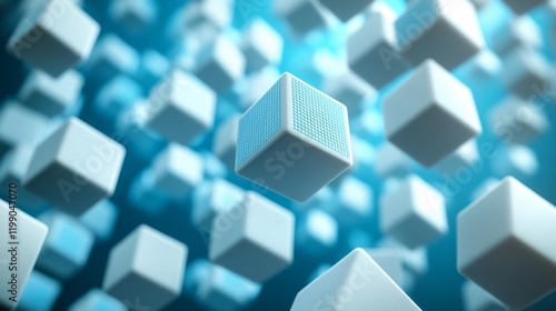 © Alexey, Obraz premium Dynamic 3D White Cubes with Blue Grid Pattern. Generative AI