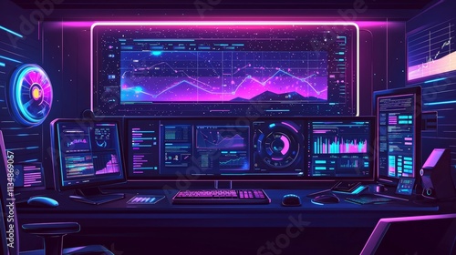 Obraz premium Dynamic data visualization setup home office digital artwork futuristic...