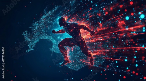 Naklejka premium Dynamic digital art showcasing a male athlete in motion, surrounded by vibrant glowing particles and abstract lines, symbolizing speed and energy.