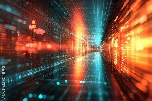 Fototapeta premium Dynamic digital corridor illuminated with vibrant blue and orange light...