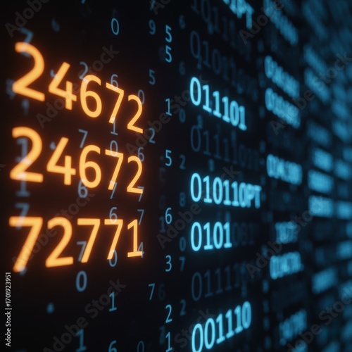 Obraz premium Dynamic digital data stream with glowing orange and blue numbers representing...