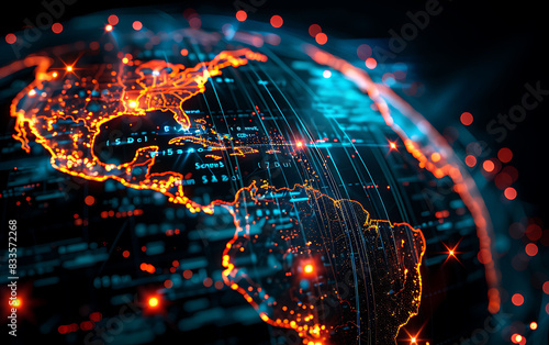 Obraz premium Dynamic digital globe of Americas with rapid, glowing data lines illustrating...
