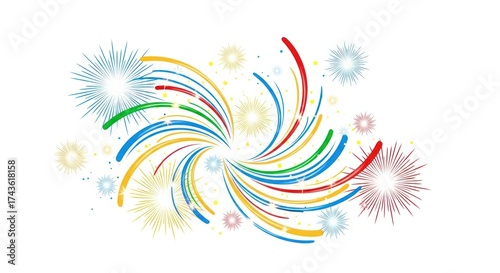 © Aetheria, Obraz premium Dynamic display of colorful fireworks radiating outwards on a white background, creating a festive