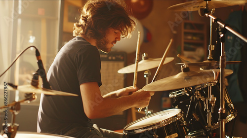 Fototapeta premium Dynamic Drummer Performing Live Music on Drums with Passion and Precision.