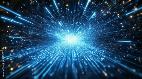 Obraz premium Dynamic explosion of blue light particles creating a radiant, futuristic effect, symbolizing speed, technology, and energy.