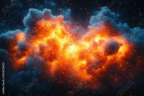 © Somboon, Naklejka premium Dynamic explosion of glowing particles cosmic space abstract art dark environment high fidelity visualization