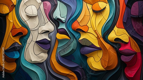 © Paul, Obraz premium Dynamic face-off scene with faces of different abstract shapes and colors, creating a mysterious and engaging visual spectacle