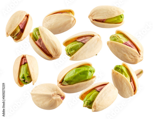 © MdAmzad, Fototapeta premium Dynamic Falling Pistachio Nuts, Half-Open, Motion Effect, Isolated