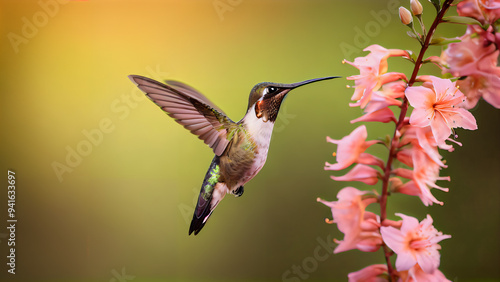 © Viktoriia, Naklejka premium Dynamic flight of a hummingbird with blurred wings and a sharp focus on the body, hovering near a branch with pink flowers, with bright green and white plumage, brownish gray underparts and iridescent