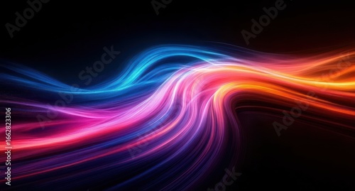 Obraz premium Dynamic flowing light streaks in vibrant blue, pink, purple, and orange colors against a dark background creating a sense of motion and energy