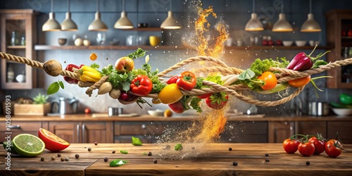 Fototapeta premium Dynamic food photography captures the dramatic moment of a rope breaking, sending ingredients flying in an artistic blend of flavors and culinary excitement. A visual feast!
