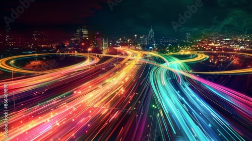 Obraz premium Dynamic Futuristic Highway with Neon Light Trails at Night