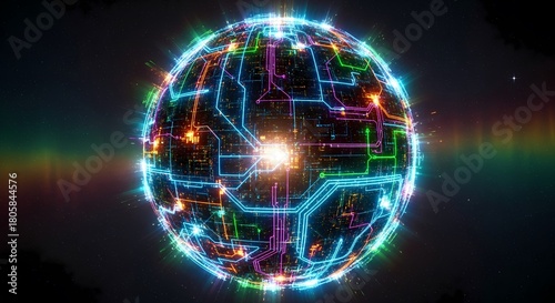 © msk, Obraz premium Dynamic global network with bright neon circuits in space for tech projects