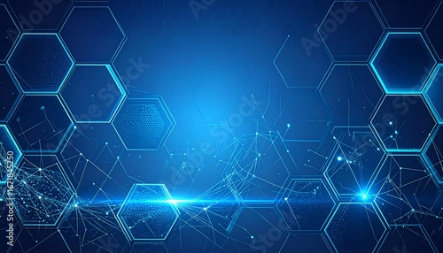 Obraz premium Dynamic glowing blue hexagonal network grid with interconnected nodes and...