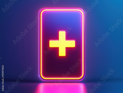 © Siripong, Fototapeta premium Dynamic health plus sign icon studio setting digital art neon glow close-up modern health concept