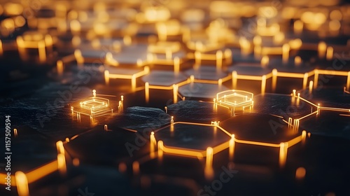 Obraz premium Dynamic hexagonal patterns with glowing edges abstract digital art technology concept dark environment close-up view