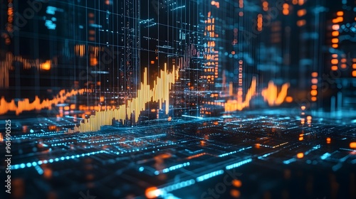 © Heng Heng - AI Stock, Fototapeta premium Dynamic holographic visualization illustrating the latest trends and fluctuations in the cryptocurrency market using futuristic digital data analytics and financial charting