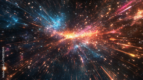 Naklejka premium Dynamic hyperspace streaks converge with bright lens flare, creating a sense...
