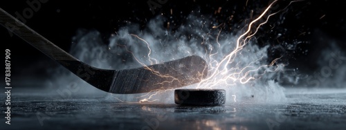 © Ilmi, Fototapeta premium Dynamic Ice Hockey Moment: Stick Striking Puck Creating Burst of Icy Mist and Light in Action
