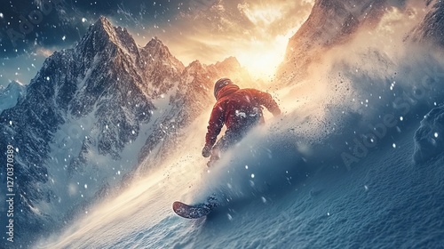 © SyabilaSyifa, Naklejka premium Dynamic image of a snowboarder carving through fresh powder in the mountains