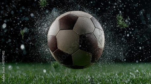 Fototapeta premium Dynamic image of a soccer ball in mid-air with water droplets, set against a...