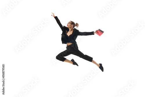 © master1305, Fototapeta premium Dynamic image of motivated and enthusiastic woman in formal wear, in mid-air pose reaching professional success and growth isolated on white background. Concept of business, office lifestyle
