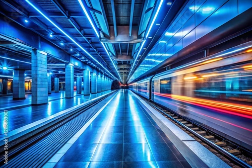© Arnada, Fototapeta premium Dynamic Light Trails: Empty Underground Metro Station at Night - Blue Illumination Long Exposure Drone Shot