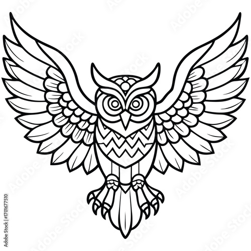 Fototapeta premium Dynamic line art vector illustration of an adult owl in flight scalable eps graphic adult coloring
