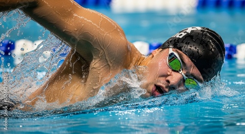Fototapeta premium Dynamic male swimmer in action with water splash in pool