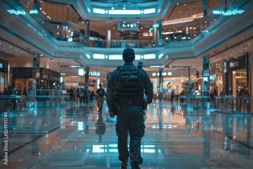 Obraz premium Dynamic mall interior. A lone figure stands in a modern shopping mall. Bright lights and busy atmosphere define the space. This photo can be used for security themes or futuristic concepts