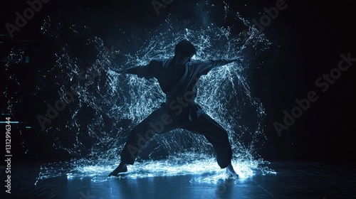 © Nut._.tps, Fototapeta premium Dynamic Martial Artist Posing Amidst Blue Energy Effects