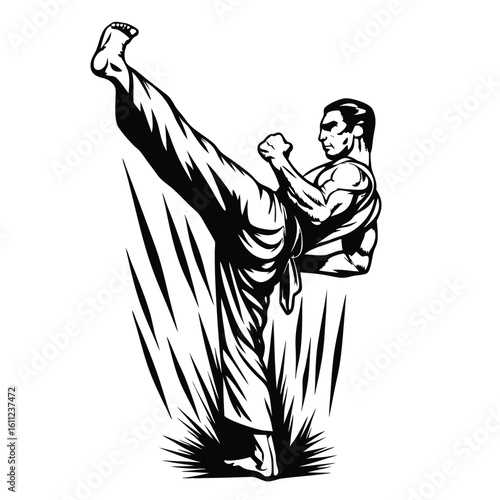 Fototapeta premium Dynamic Monochrome Illustration of a Martial Artist Executing a High Kick...