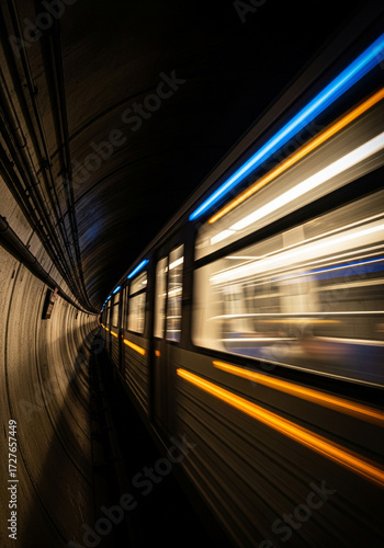 © Saharat, Fototapeta premium Dynamic Motion Blur of Subway Train in Tunnel
