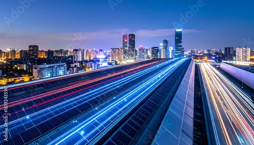 © Harno, Fototapeta premium Dynamic motion of vibrant light trails over a sprawling urban landscape at night