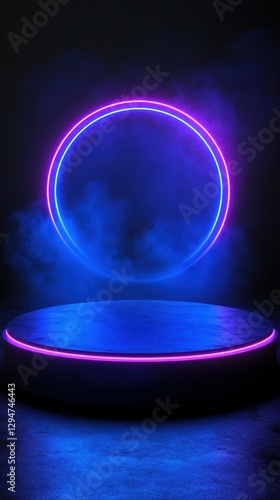 Obraz premium Dynamic neon stage with circular lighting and atmospheric haze, ideal for...