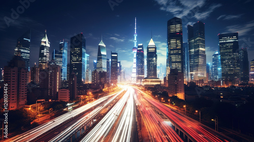 © Shades3d, Fototapeta premium Dynamic Night Cityscape with Illuminated Skyscrapers
